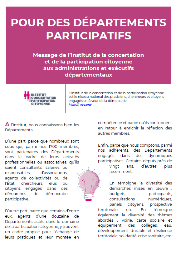Nous avons donc eu à cœur de rédiger un message à leur intention[su_button url= »https://icpc.naro.studio/wp-content/uploads/2021/09/Pour-des-d%C3%A9partements-participatifs-Message-de-lICPC-VF.pdf » background= »#eéààèaE » color= »#E2007A » size= »6″ center= »yes » radius= »0″ icon: pencil-square-o » icon_color= »#E2007A »]Découvrez le message de l’ICPC[/su_button]